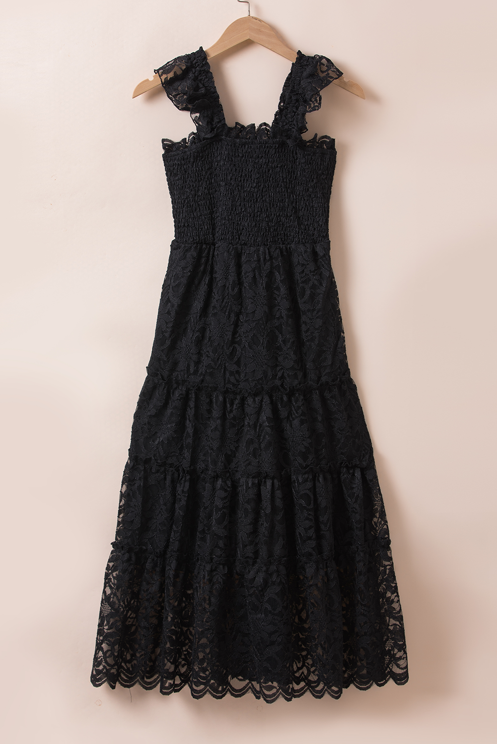 Black Lace Smocked Bodice Sleeveless Midi Dress