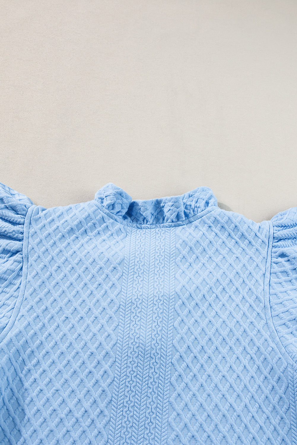 Light Blue Textured Puff Sleeve Ruffled V Neck Shift Mini Dress